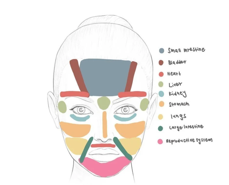 Traditional Chinese Medicine (TCM) is a form of Eastern Medicine that has been used successfully for thousands of years and can give us many insights on how to restore balance to the body. TCM believes that the face is the map to your internal health status. In fact, each area of the face is connected to a specific organ system that may be out of balance. For example, you may notice hormonal acne around your chin or jawline as this section of the face is linked to the reproductive system. Additionally, you may notice acne on the forehead after eating dairy or any food that you are particularly sensitive to, as this section of the face is linked to the small intestine, which is responsible for absorption and assimilation of our food's nutrients into our systemic circulation. The TCM map can be a great tool to help you and your practitioner know where to get started in terms of testing and building your personalized treatment plan.